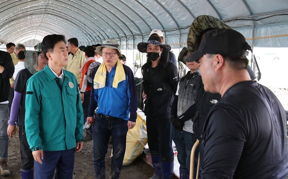 김태흠 지사 '집중호우 피해' 공주 찾은 윤석열 대통령 만나 특별재난지역·시설작물 지원 재건…