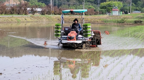 천안시, 동면 김현수 씨 논에서 올해 첫 모내기 실시