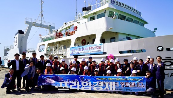 김지철 교육감, 한내호 승선 실습 출항식 전 충남해양과학고 학생들 현장 격려