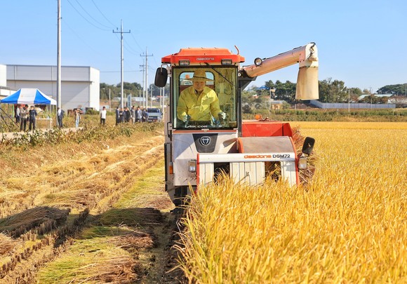 [당찬 당진] 오성환 당진시장, 벼 수확 현장에서 벼 베기 시연 및 농민 격려