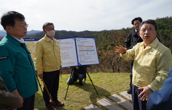 [포토] 남성현 산림청장, 울진 산불피해 복원 지역 현장 점검