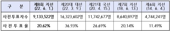 제8회 지방선거 사전투표율 20.62%, 913만여 명 참여