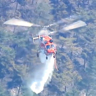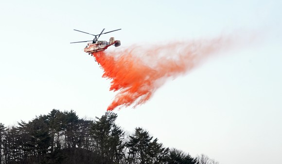 [포토] 금강소나무 군락지 지키기 위해 산불진화헬기 산불지연제 투하