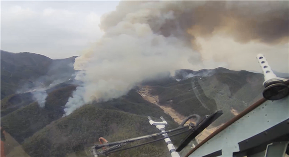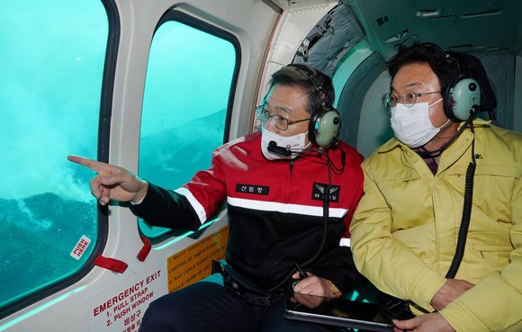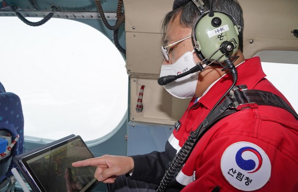 [포토] 최병암 산림청장, 공중지휘헬기에서 경남 합천군, 경북 고령군 산불진화 상황 파악