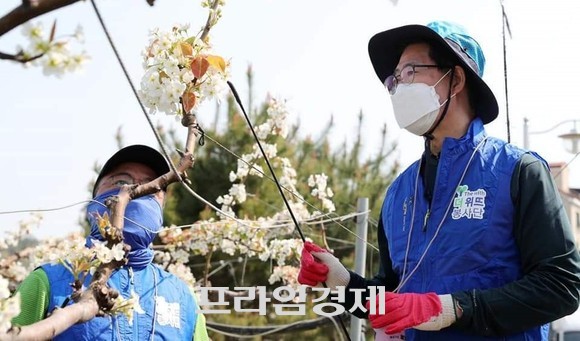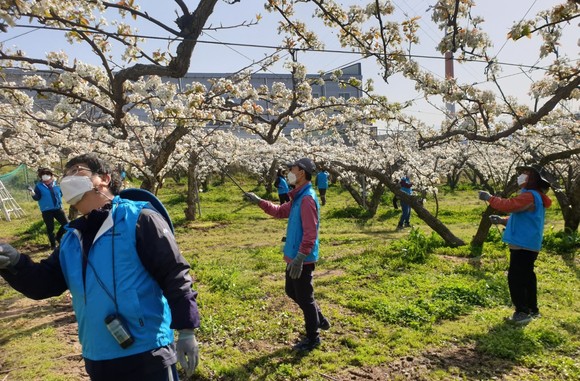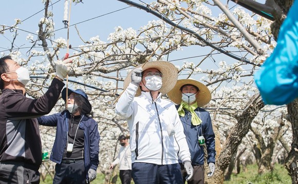 천안시 직산읍, 배꽃 인공수분 일손 돕기 나서