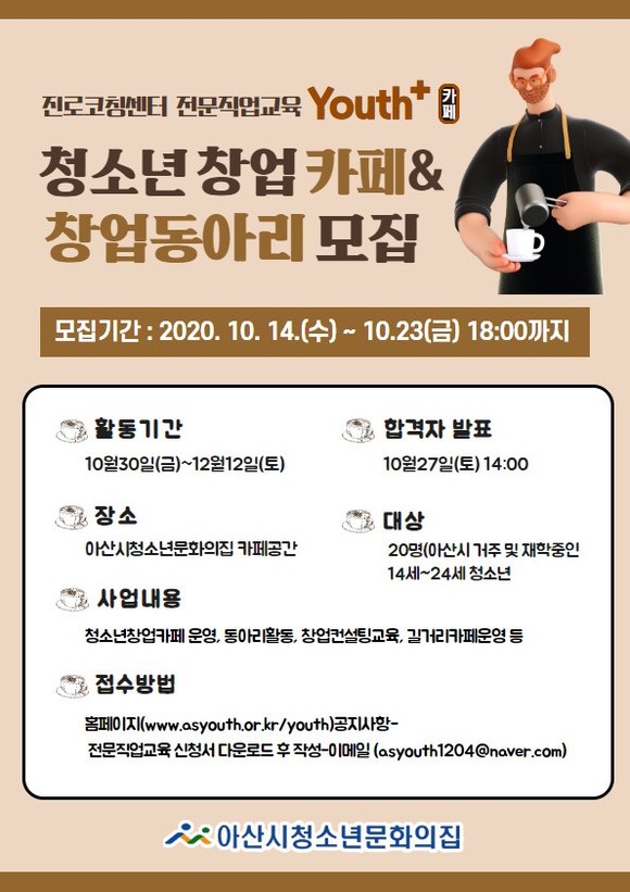아산시청소년문화의집 진로코칭센터청소년창업카페 'YOUTH+' 운영 참가자 모집