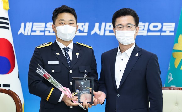 허태정 대전시장 김태섭 경장에 '의로운 시민' 표창패 수여