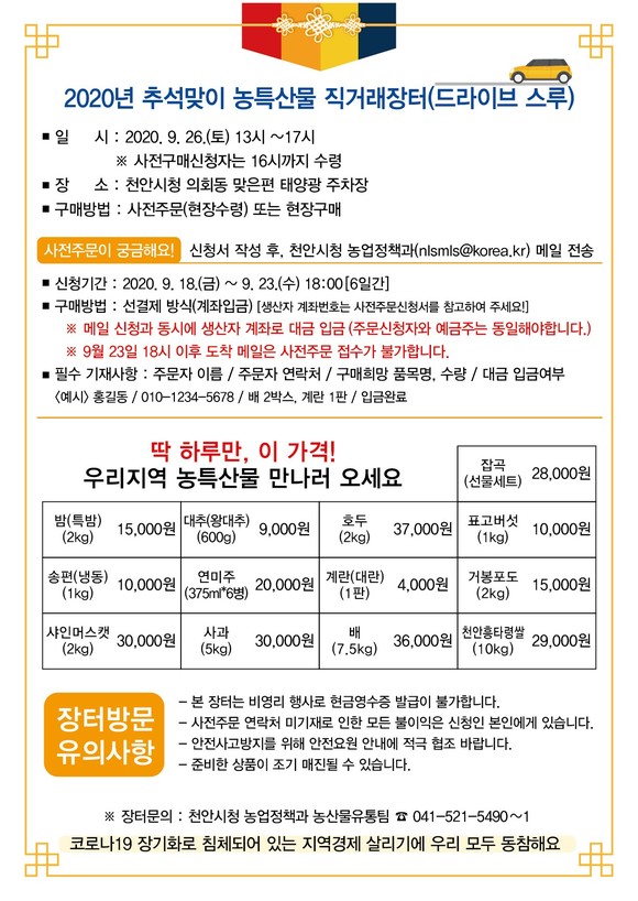 천안시 추석맞이 '농특산물 드라이브 스루 장터' 운영