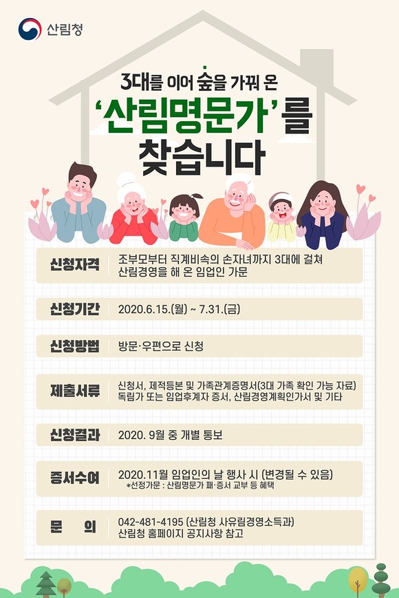 산림청 "3대를 이어 숲을 가꿔 온 산림명문가를 찾습니다"