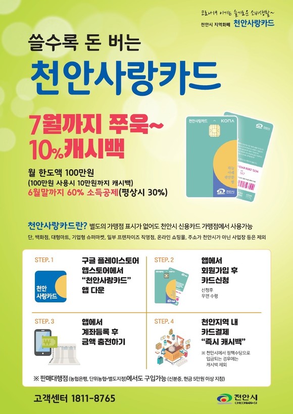 천안시, 천안사랑카드 월 캐시백 혜택한도 100만원 상향