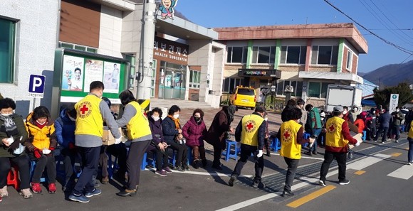 금산 남이적십자봉사회, 마스크 구매 행렬 음료 봉사