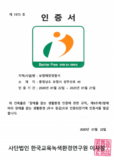 보령해경, 대형 청사 최초 장애물 없는 생활환경 인증(BF) 획득