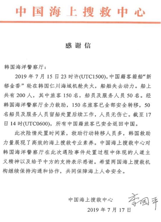 中해양수색구조센터 "화재 선박 승객 구조 해양경찰청에 감사"