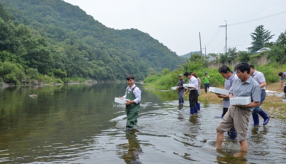 부여군 은산면 지천에서 참게, 다슬기 등 수산자원 종묘 방류 행사