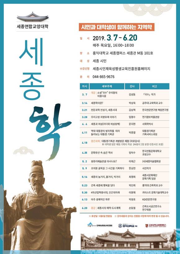 세종연합교양대학 '세종학' 7일 홍익대 세종캠퍼스서 개강