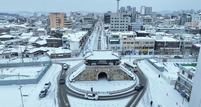 [포토] "하얀 눈으로 덮인 홍성" 홍성군청·홍주읍성·조양문 설경 장관