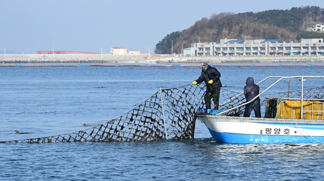 [포토] 홍성군 남당항, 추위 속에서도 김 수확 한창