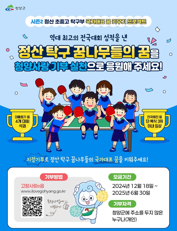 청양군 '정산 초·중·고 탁구부 국가대표 꿈 키우기 프로젝트' 시즌2 지정 기부 모금 시작