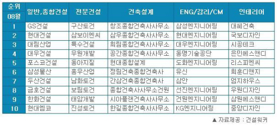8월 건설사 취업인기, GS건설·삼성엔지니어링 1위