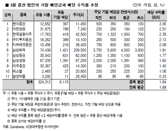 “3월 결산법인 11개 종목 배당총액 6115억 풀릴 것”