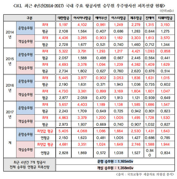 "대한항공 승무원 우주방사선 피폭량 최고"