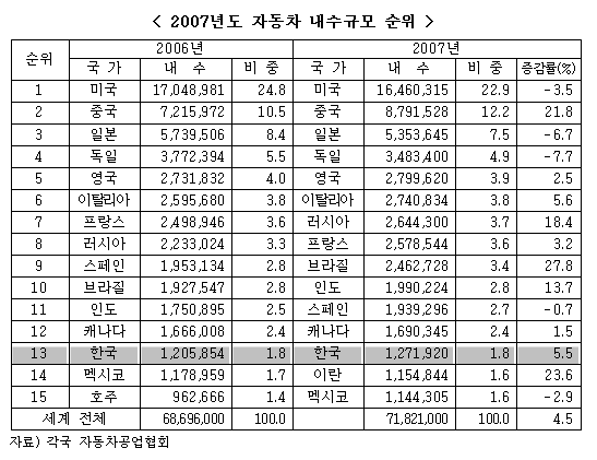 국내 자동차 내수규모, 세계 13위
