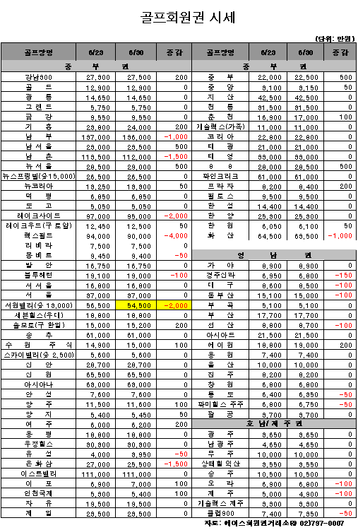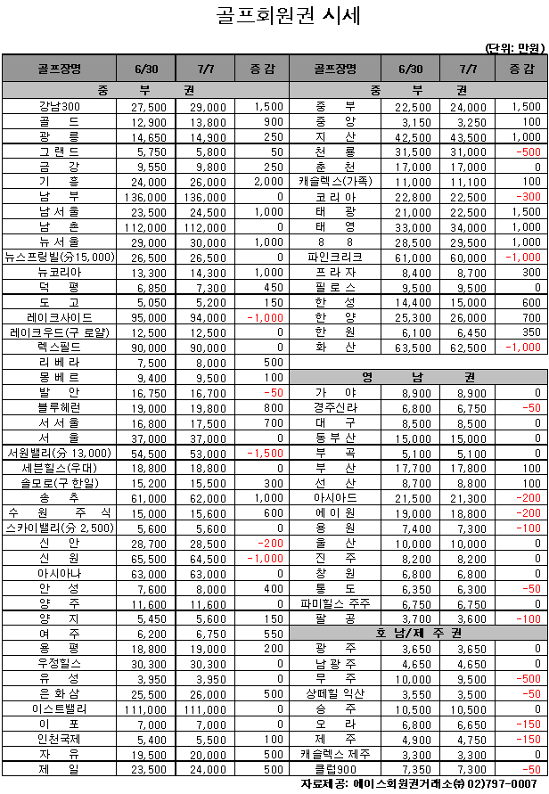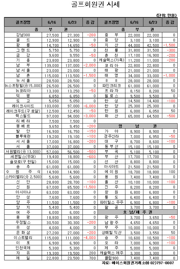[골프회원권 시세] 고가권 하락, 중저가권 보합