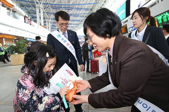 권선주 은행장, 서울역서 설 맞이 복주머니 선물