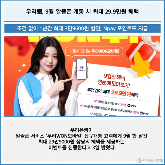 [카드] 우리銀, 9월 알뜰폰 개통 시 최대 29.9만원 혜택