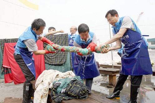 신한은행 본부장들, 이불빨래로 이주민 도와