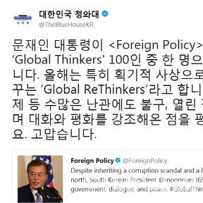 포린폴리시, 문재인 대통령 '세상을 바꾼 올해의 사상가' 선정