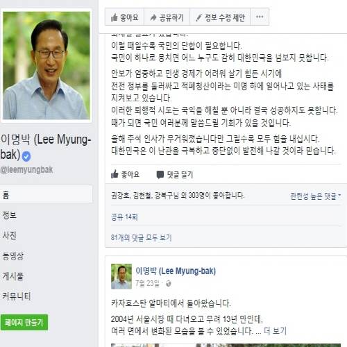 MB, 페이스북 통해 '적폐청산 사태는 퇴행적' 폄하
