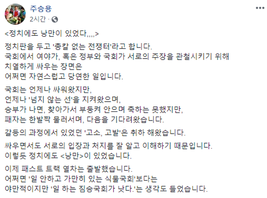 주승용 부의장, 패스트트랙 관련 여야대립 중재 SNS글 게재