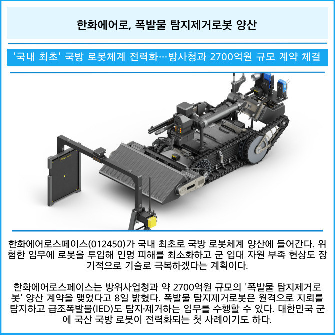 [카드] 한화에어로, 폭발물 탐지제거로봇 양산