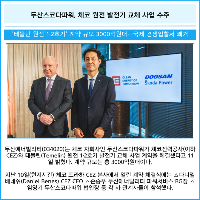 [카드] 두산스코다파워, 체코 원전 발전기 교체 사업 수주