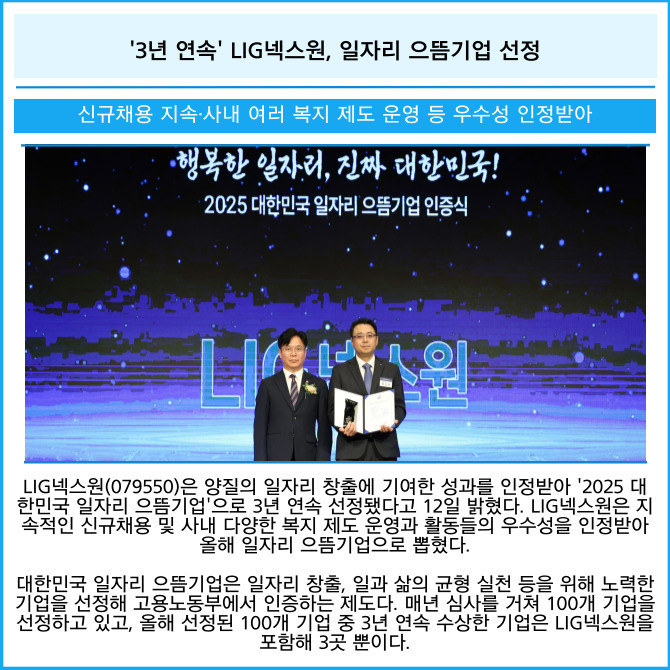 [카드] '3년 연속' LIG넥스원, 일자리 으뜸기업 선정