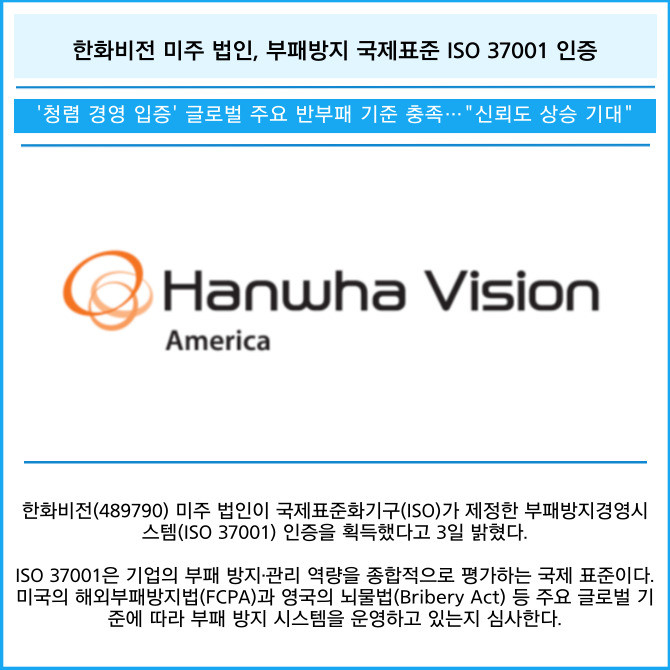 [카드] 한화비전 미주 법인, 부패방지 국제표준 ISO 37001 인증