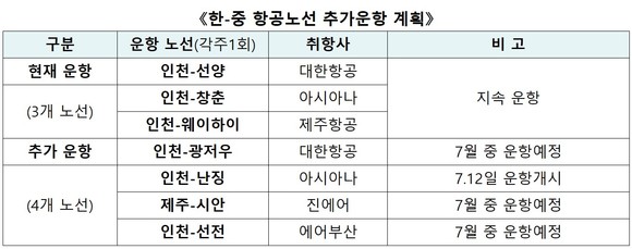 "주당 20회" 한-중 항공노선 추가 운항