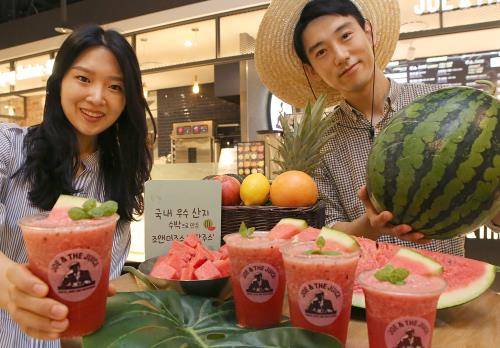 [포토] 현대百 "시원한 수박주스 맛보세요"