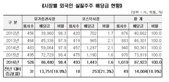 작년 외국인 주주 배당금 비율 41%…전년比 3.0%p↑