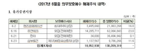 6월 37개사 1억6611만주 의무보호예수 해제