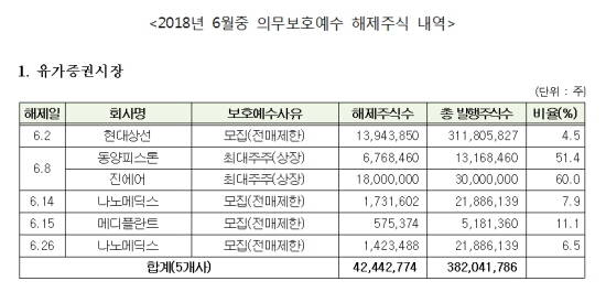 6월 중 진에어 포함 총 35개사 의무보호예수 해제