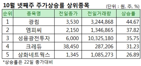 10월 마지막주 주가상승률 상위종목 TOP 5