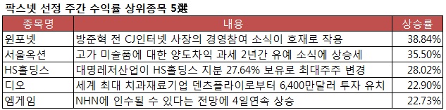 팍스넷 선정 12월 첫째 주 주간수익률 상위종목